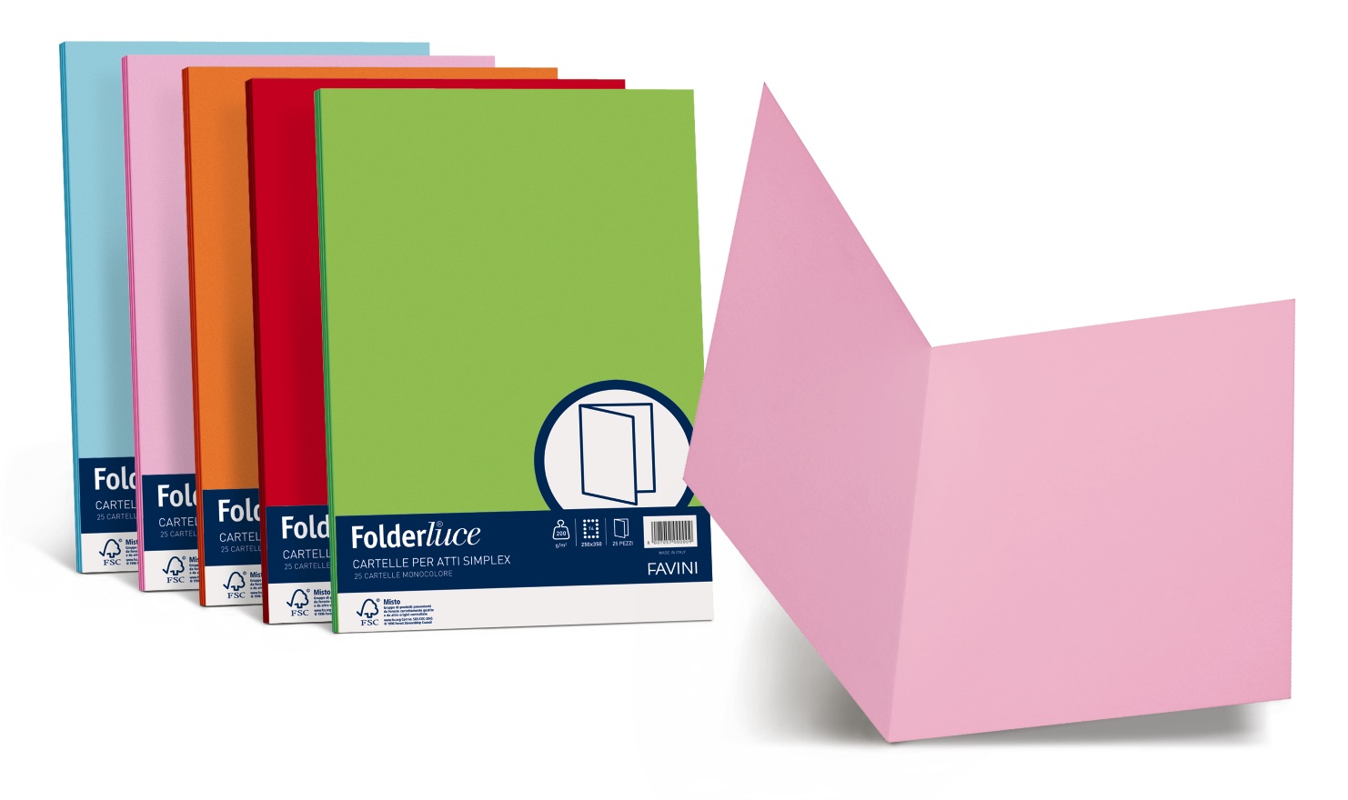 Cartelle in cartoncino bristol da 200 g/mq. Formato cartelle semplici 25x34 cm in colori brillanti assortiti.