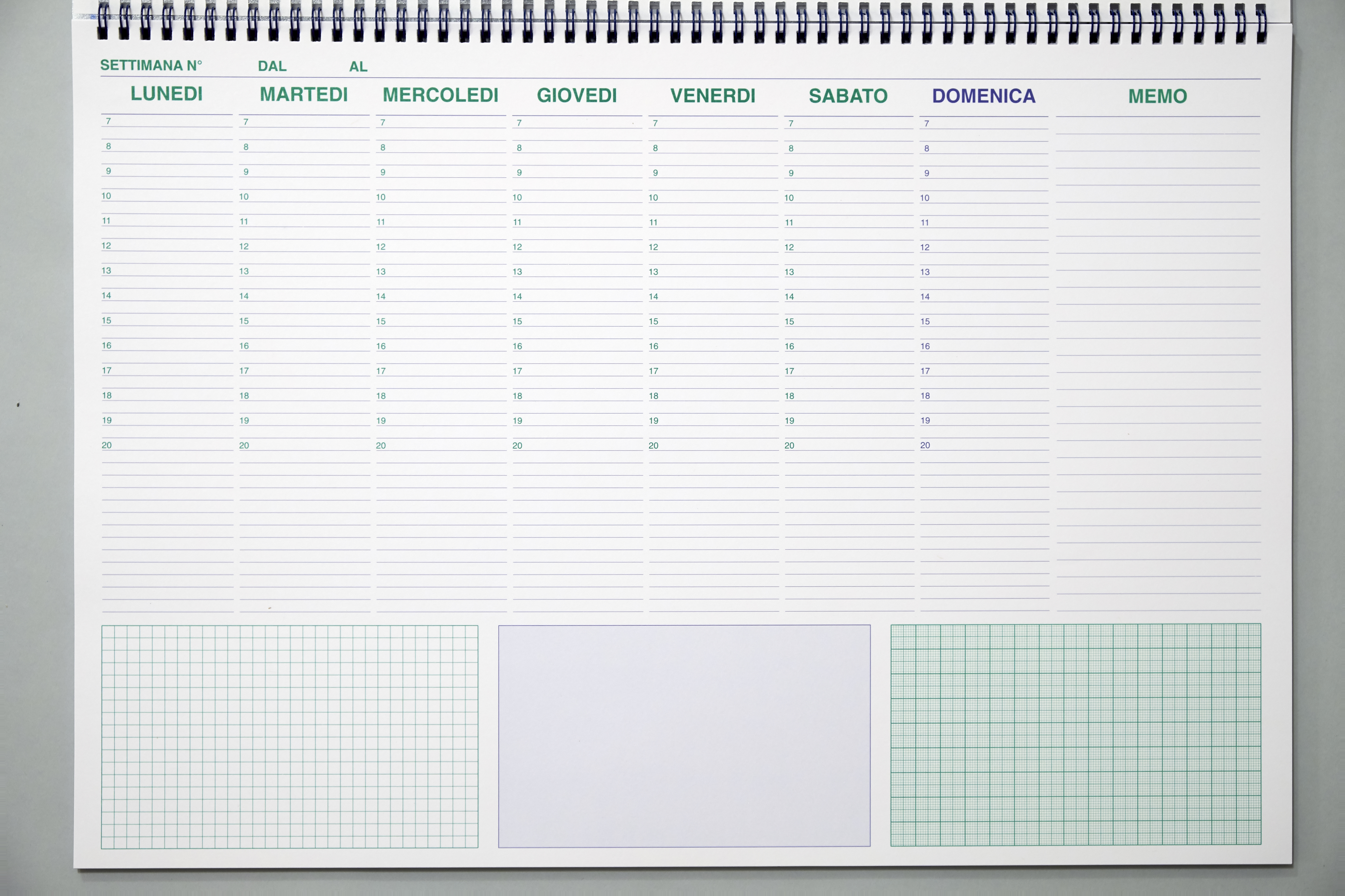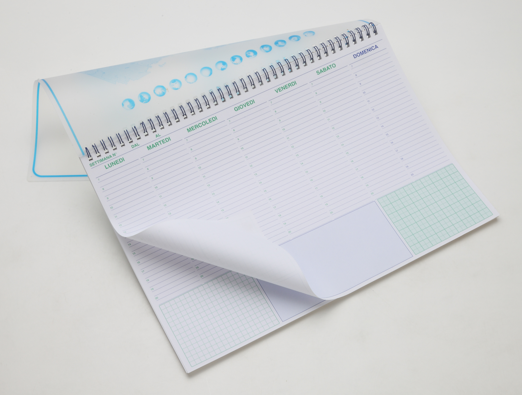 Sottomano nel formato 49x34 cm. Carta naturale bianca 80 gr. 52 Fogli, stampa a 2 colori. Cartoncino finale di supporto, incollato al piede: