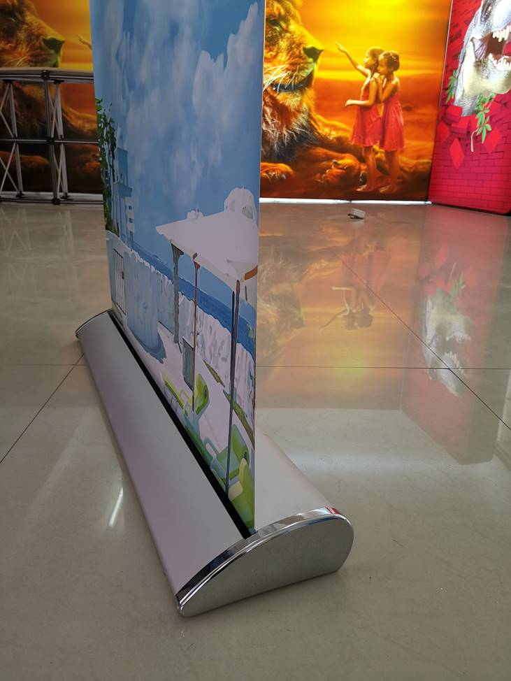 Elegante espositore con profilo a goccia e banda lucida a specchio.